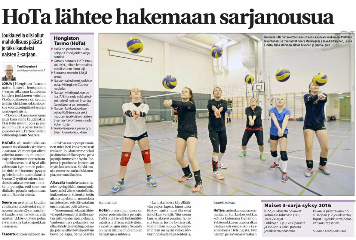 Länsi-Uusimaan juttu to 6.10.2016 Naisten 1-joukkue: A/B-tytöistä Noora Mäkelä, Tuula Talvitie, Inka Kärkkäinen, Iida Mäki, Julia Komulainen, Janna Helander, Janika Eloranta, Salla Seger, Jenni Kärkkäinen ja kokeneempia pelaajina Eija Kärnä sekä Leena Einistö. Vastuuvalmentajina Sami Saarela ja Pasi Helander